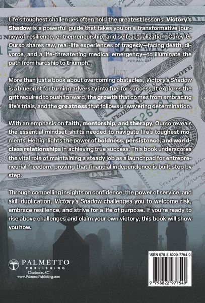 An empowering read on resilience and entrepreneurship: overcoming tragedy, leveraging employment, fostering team building, wise expense management, and transitioning to financial independence. Victory's Shadow is a beacon of inspiration, charting a journey marked by resilience, entrepreneurship, and personal development. It directly addresses the pivotal role of a regular job in fueling and nurturing a business until it evolves into a self-sustaining entity, delivering financial freedom. Through personal stories of tragedy, including death, divorce, and a life-threatening medical emergency, discover how to find strength in adversity and uncover blessings in life's shadows from Carey G. Ourso's real, lived experiences. The book emphasizes faith, mentorship, and therapy for navigating challenges, while boldness, persistence, and world-class relationships drive success. Within the book chapters, readers will learn how to leverage their jobs to build a business that leads to financial independence. Learn to create lasting income by building a strong team, managing expenses, and shifting from trading time for money to generating freedom through effective systems. Finally, Ourso highlights the importance of believing in your capabilities, serving others, and embracing risks to achieve a life of purpose and impact. Victory's Shadow offers hope and motivation and empowers readers to overcome obstacles and achieve their personal and professional goals, transforming challenges into opportunities for growth and fulfillment.