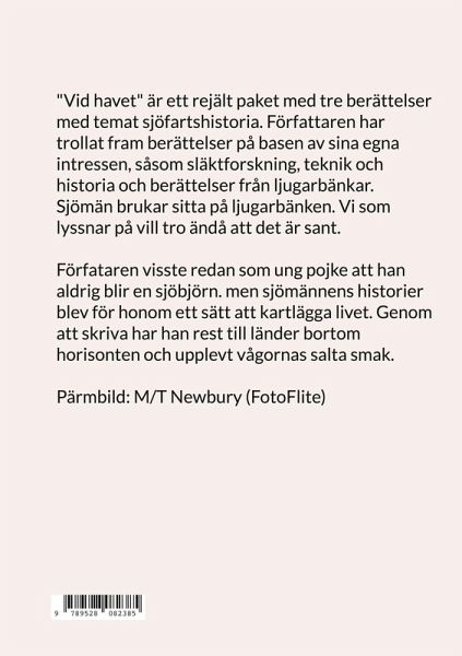 "Vid havet" är ett rejält paket med tre berättelser med temat sjöfartshistoria. Författare har trollat fram berättelser från sina egna intressen, såsom släktforskning, historia av teknik och berättelser från ljugarbänkar. Sjömän brukar sitta på ljugarbänken. Vi som lyssnar på vill tro ändå att det är sant.