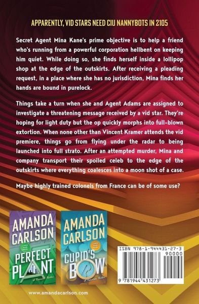 Apparently, vid stars need CIU NannyBots in 2105. Secret Agent Mina Kane's prime objective is to help a friend who's running from a powerful corporation hellbent on keeping him quiet. While doing so, she finds herself inside a lollipop shop at the edge of the outskirts. After receiving a pleading request, in a place where she has no jurisdiction, Mina finds her hands are bound in purelock. Things take a turn when she and Agent Adams are assigned to investigate a threatening message received by a vid star. They're hoping for light duty but the op quickly morphs into full-blown extortion. When none other than Vincent Kramer attends the vid premiere, things go from flying under the radar to being launched into full strato. After an attempted murder, Mina and company transport their spoiled celeb to the edge of the outskirts where everything coalesces into a moon shot of a case. Maybe highly trained colonels from France can be of some use?
