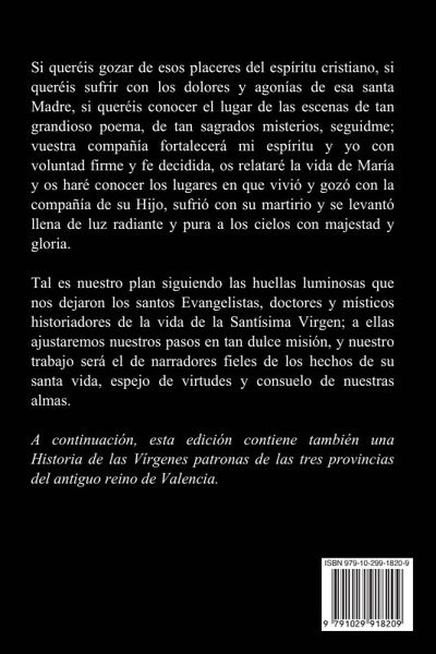 Si queréis gozar de esos placeres del espíritu cristiano, si queréis sufrir con los dolores y agonías de esa santa Madre, si queréis conocer el lugar de las escenas de tan grandioso poema, de tan sagrados misterios, seguidme; vuestra compañía fortalecerá mi espíritu y yo con voluntad firme y fe decidida, os relataré la vida de María y os haré conocer los lugares en que vivió y gozó con la compañía de su Hijo, sufrió con su martirio y se levantó llena de luz radiante y pura a los cielos con majestad y gloria. Tal es nuestro plan siguiendo las huellas luminosas que nos dejaron los santos Evangelistas, doctores y místicos historiadores de la vida de la Santísima Virgen; a ellas ajustaremos nuestros pasos en tan dulce misión, y nuestro trabajo será el de narradores fieles de los hechos de su santa vida, espejo de virtudes y consuelo de nuestras almas. A continuación, esta edición contiene también una Historia de las Vírgenes patronas de las tres provincias del antiguo reino de Valencia.