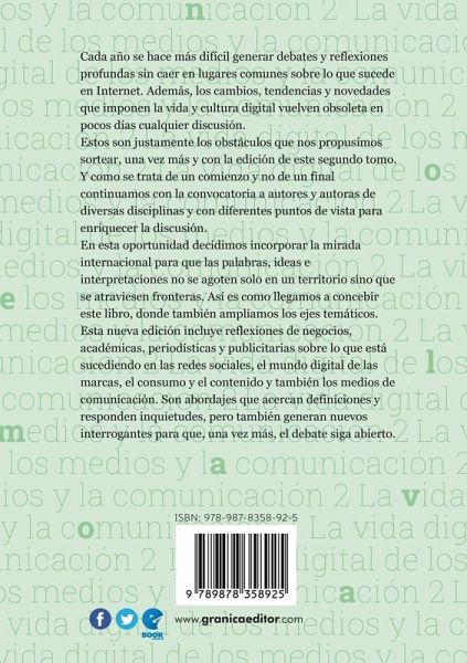 Cada año se hace más difícil generar debates y reflexiones profundas sin caer en lugares comunes sobre lo que sucede en Internet. Además, los cambios, tendencias y novedades que imponen la vida y cultura digital vuelven obsoleta en pocos días cualquier discusión. Estos son justamente los obstáculos que nos propusimos sortear, una vez más y con la edición de este segundo tomo. Y como se trata de un comienzo y no de un final continuamos con la convocatoria a autores y autoras de diversas disciplinas y con diferentes puntos de vista para enriquecer la discusión. En esta oportunidad decidimos incorporar la mirada internacional para que las palabras, ideas e interpretaciones no se agoten solo en un territorio sino que se atraviesen fronteras. Así es como llegamos a concebir este libro, donde también ampliamos los ejes temáticos. Esta nueva edición incluye reflexiones de negocios, académicas, periodísticas y publicitarias sobre lo que está sucediendo en las redes sociales, el mundo digital de las marcas, el consumo y el contenido y también los medios de comunicación. Son abordajes que acercan definiciones y responden inquietudes, pero también generan nuevos interrogantes para que, una vez más, el debate siga abierto.