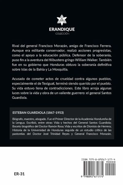 Rival del general Francisco Morazán, amigo de Francisco Ferrera. Aunque era militante conservador, realizó acciones progresistas, como el apoyo a la educación pública. Defensor de la soberanía, puso fin a la aventura del filibustero gringo William Walker. También fue en su gobierno que Honduras obtuvo la soberanía definitiva sobre Islas de la Bahía y La Mosquitia. Acusado de cometer actos de crueldad contra algunos pueblos, especialmente el de Texiguat, terminó siendo querido por el pueblo. Su vida estuvo llena de contradicciones. Este libro arroja algunas luces sobre la vida y obra de un valiente guerrero: el general Santos Guardiola.