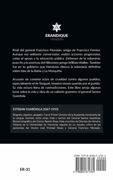 Rival del general Francisco Morazán, amigo de Francisco Ferrera. Aunque era militante conservador, realizó acciones progresistas, como el apoyo a la educación pública. Defensor de la soberanía, puso fin a la aventura del filibustero gringo William Walker. También fue en su gobierno que Honduras obtuvo la soberanía definitiva sobre Islas de la Bahía y La Mosquitia. Acusado de cometer actos de crueldad contra algunos pueblos, especialmente el de Texiguat, terminó siendo querido por el pueblo. Su vida estuvo llena de contradicciones. Este libro arroja algunas luces sobre la vida y obra de un valiente guerrero: el general Santos Guardiola.