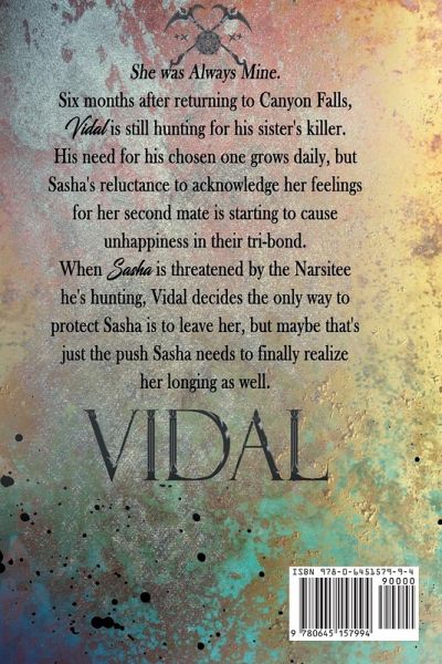 Six months after returning to Canyon Falls, Vidal is still hunting for his sister's killer. His need for his chosen one grows daily, but Sasha's reluctance to acknowledge her true feelings for her second mate is starting to cause unhappiness in their tri-bond. When Sasha is threatened by the Narsitee he's hunting, Vidal decides the only way to protect her is to leave her, but maybe that's just the push Sasha needs to finally realize her longing as well. This is a continuation of Sasha's story written Dual POV with Vidal. Tropes: Friends to Lovers, MFM, soul mates.