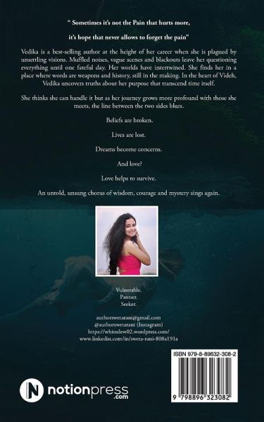 " Sometimes it's not the Pain that hurts more, it's hope that never allows to forget the pain" Vedika is a best-selling author at the height of her career when she is plagued by unsettling visions. Muffled noises, vague scenes and blackouts leave her questioning everything until one fateful day. Her worlds have intertwined. She finds her in a place where words are weapons and history, still in the making. In the heart of Videh, Vedika uncovers truths about her purpose that transcend time itself. She thinks she can handle it but as her journey grows more profound with those she meets, the line between the two sides blurs. Beliefs are broken. Lives are lost. Dreams become concerns. And love? Love helps to survive. An untold, unsung chorus of wisdom, courage and mystery sings again.