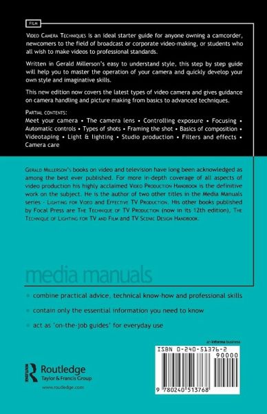 Video Camera Techniques is an ideal starter guide for anyone owning a camcorder, newcomers to the field of broadcast or corporate video-making, or students who all wish to make videos to professional standards. Written in Gerald Millserson's easy to understand style, this step by step guide will help you to master the operation of your camera and quickly develop your own style and imaginative skills.This new edition now covers the latest types of video camera and gives guidance on camera handling and picture making form basics to advanced techniques.Gerald Millerson's books on video and television have long been acknowledged as among the best ever published. For more in-depth coverage of all aspects of video production his highly acclaimed Video Production Handbook is the definitive work on the subject. He is the author of two other titles in the Media Manuals series - Lighting for Video and Effective TV Production. His other books published by Focal Press are The Technique of TV Production (now in its 12th edition), The Techniques of Lighting for TV and Film and TV Scenic Design Handbook.