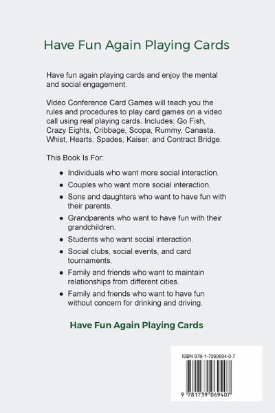 Video Conference Card Games are real-life card games adapted for play on video calls. The book's goal is to bring card games to the virtual world while maintaining the integrity of the games. This book includes gameplay rules and procedures to play on a video call using real playing cards. The included games are Go Fish, Crazy Eights, Cribbage, Scopa, Rummy, Canasta, Whist, Hearts, Spades, Kaiser, and Contract Bridge. This step-by-step instruction guide includes Communications Device Set-Up, Game Set-Up, Gameplay System, and Example Gameplay. It does not explain rules unrelated to how to play on a video call. This Book Is For:Individuals who want more social interaction. Couples who want more social interaction. Sons and daughters who want to have fun with their parents. Grandparents who want to have fun with their grandchildren. Students who want more social activity. Family and friends who want to maintain relationships from different cities. Family and friends who want to have fun without concern for drinking and driving.