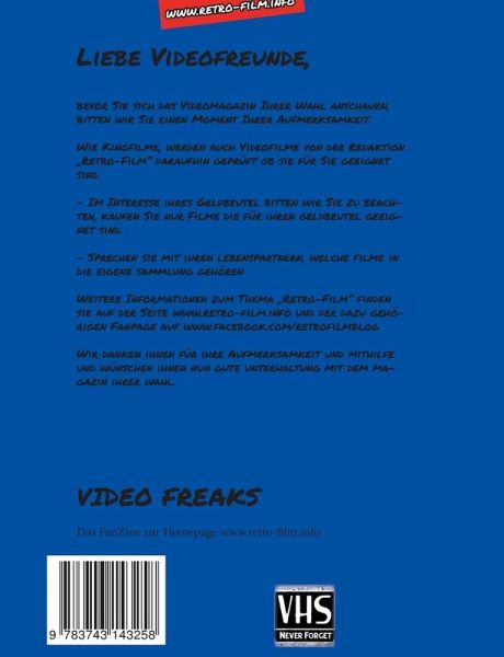 Liebe Videofreunde,bevor Sie sich das Videomagazin Ihrer Wahl anschauen, bitten wir Sie einen Moment Ihrer Aufmerksamkeit.Wie Kinofilme, werden auch Videofilme von der Redaktion Retro-Film daraufhin geprüft ob sie für Sie geeignet sind.- Im Interesse ihres Geldbeutel bitten wir Sie zu beachten, kaufen Sie nur Filme die für ihren Geldbeutel geeignet sind.- Sprechen sie mit ihren Lebenspartnern, welche filme in die eigene Sammlung gehörenWir danken ihnen für ihre Aufmerksamkeit und mithilfe und wünschen ihnen nun gute Unterhaltung mit dem Magazin ihrer Wahl.VIDEO FREAKS
