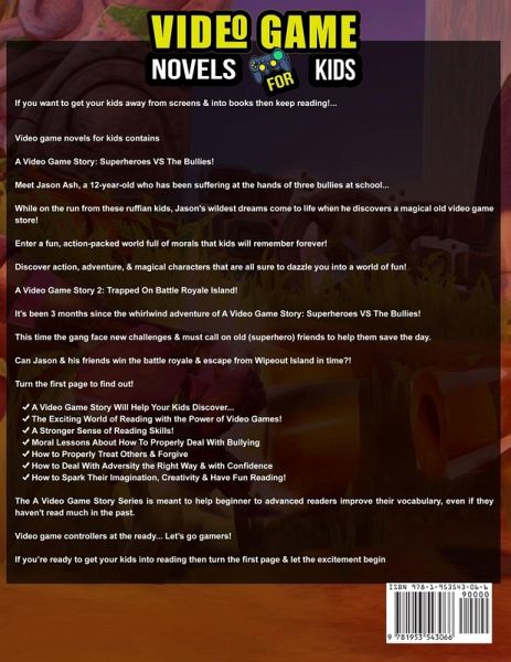 If you want to get your kids away from screens & into books then keep reading!.. 'Video Game Novels for kids - 2 In 1 Bundle' Contains: 'A Video Game Story: Superheroes VS The Bullies!' Meet Jason Ash, a 12-year-old who has been suffering at the hands of three bullies at school... While on the run from these ruffian kids, Jason's wildest dreams come to life when he discovers a magical old video game store! Enter a fun, action-packed world full of morals that kids will remember forever! Discover action, adventure, & magical characters that are all sure to dazzle you into a world of fun! 'A Video Game Story 2: Trapped On Battle Royale Island!' It's been 3 months since the whirlwind adventure of 'A Video Game Story: Superheroes VS The Bullies!' This time the gang face new challenges & must call on old (superhero) friends to help them save the day. Can Jason & his friends win the battle royale & escape from Wipeout Island in time?! Turn the first page to find out! A Video Game Story Will Help Your Kids Discover...The Exciting World of Reading with the Power of Video Games! A Stronger Sense of Reading Skills! Moral Lessons About How To Properly Deal With Bullying How to Properly Treat Others & Forgive How to Deal With Adversity the Right Way & with Confidence How to Spark Their Imagination, Creativity & Have Fun Reading! The A Video Game Story Series is meant to help beginner to advanced readers improve their vocabulary, even if they haven't read much in the past. Video game controllers at the ready... Let's go gamers! If you're ready to get your kids into reading then click "Add to cart" & let the excitement begin!