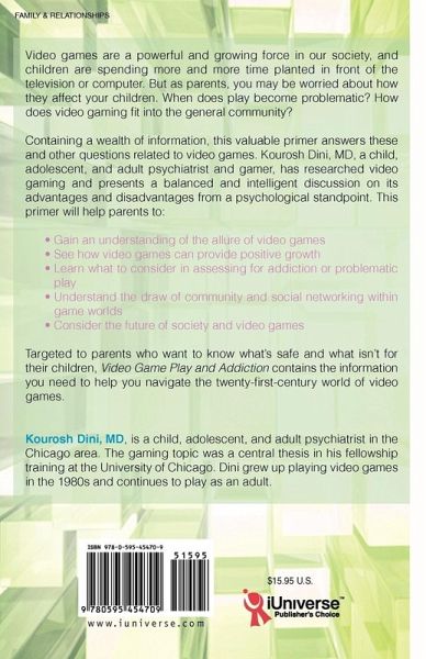 Video games are a powerful and growing force in our society, and children are spending more and more time planted in front of the television or computer. But as parents, you may be worried about how they affect your children. When does play become problematic? How does video gaming fit into the general community? Containing a wealth of information, this valuable primer answers these and other questions related to video games. Kourosh Dini, MD, a child, adolescent, and adult psychiatrist and gamer, has researched video gaming and presents a balanced and intelligent discussion on its advantages and disadvantages from a psychological standpoint. This primer will help parents to: Gain an understanding of the allure of video games See how video games can provide positive growth Learn what to consider in assessing for addiction or problematic play Understand the draw of community and social networking within game worlds Consider the future of society and video games Targeted to parents who want to know what's safe and what isn't for their children, Video Game Play and Addiction contains the information you need to help you navigate the twenty-first-century world of video games.