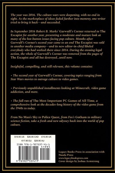 The year was 2016. The culture wars were deepening, with no end in sight. As the marketplace of ideas faded further into memory, one writer tried to bring it back – and succeeded. In September 2016 Robert B. Marks’ Garwulf’s Corner returned to The Escapist for another year, presenting a moderate and mature look at many of the hot-button issues facing pop culture. Months after Garwulf’s Corner’s second year came to an end the Escapist was sold to another media company – and its new editor-in-chief libeled everybody who had worked there since 2014. During the ensuing legal action, the whole of…mehr