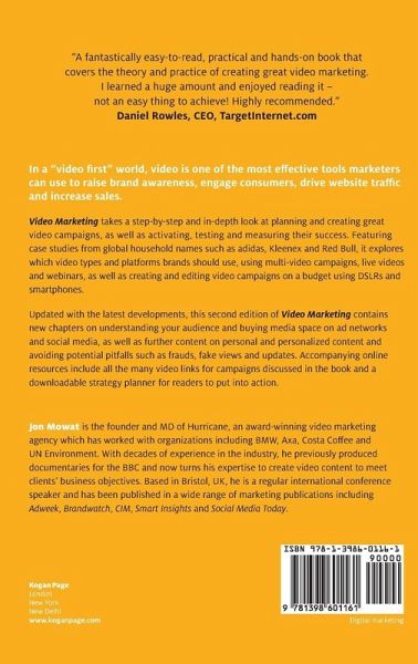 Section ONE: Video marketing strategy An introduction; Chapter 01: What is video marketing?; Chapter 02: Why video marketing works; Chapter 03: Understand your audience; Chapter 04: Video types and platforms; Section TWO: Creating great videos; Chapter 05: The basics of video marketing; Chapter 06: Planning effective video campaigns; Chapter 07: Storytelling and creative that changes behaviour; Chapter 08: Activation, measurement and testing; Chapter 09: Buying media space on ad networks and social media; Chapter 10: The dark underbelly of video advertising How to avoid losing money; Section THREE: DIY video projects; Chapter 11: Filming and editing; Chapter 12: Filming on a smartphone and DSLRs; Section FOUR: Creating effective video campaigns; Chapter 13: Steps 1 and 2 Where your brand content is now and setting goals; Chapter 14: Step 3 Content planning and programming strategy; Chapter 15: Step 4 Building the perfect content hub; Chapter 16: Step 5 Creating high volume video content And making it easy; Chapter 17: Step 6 Multi video campaign activation and testing (how to grow ROI)