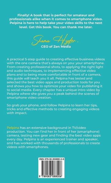 Video Smart: Make smartphone videos like a pro, is a practical 5-step guide to creating effective business videos with the one camera that's always on you: your smartphone. From creating professional shots, to applying the right light and audio techniques, to implementing effective video plans and to being more comfortable in front of a camera, this guide will teach you it all. When it comes to digital video and web marketing Video Smart is the book that gets you ready for the future. Pelpina has tested and selected the best video apps and production tools for you and shows you how to optimize your video for publishing it to social media. And all you need is your phone. In detailed steps she will show you how to optimize your videos for YouTube, Instagram, LinkedIn and Facebook. Video Smart is both for iPhone and Android users, anyone who wants to learn how to make videos with a smartphone. Whether you are marketing or communication professional, entrepreneur, teacher, mobile journalist or simply interested in making videos for social platforms, Video Smart is the guide to help your videos get noticed. Talking to a camera is not natural for most of us. In this smartphone video guide, Pelpina shows you simple steps to overcome camera fear and gain more confidence when you are presenting in front of the camera. Video Smart also guides you through interview techniques, storytelling methods and provides practical tips on how to capture people naturally. This guide in online video lays the foundation for making business videos with your phone in five steps. You always start with a basic video plan (chapter 1). After that, shoot your video using the filming tips from chapter 2. While standing in front of the camera, always keep your ideal viewer in mind (chapter 3). Then you edit the video simply with an app on your phone (chapter 4). Because you had a clear video plan, you can now also place and optimize your video on the right platform (chapter 5). ¿¿¿¿¿¿¿Every chapter in this book has a unique intro video by Pelpina where she gives you a peak behind the scenes of smartphone video creation. So grab your phone, and follow Pelpina to learn her tips, tricks and effective methods to creating engaging videos with impact. Pelpina has an extensive background in TV/video production and online video marketing. You can find her in front of her (smartphone) camera, testing new gear and finding the best video apps every day. Pelpina is an experienced trainer and speaker, and has worked with thousands of professionals to create videos with smartphones.