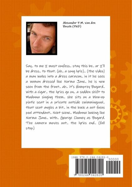 Say.. to me I must confess.. stay this be.. or I'll be dress.. to that. (oh.. a song lyric).. (the video) a man walks into a dress caravan.. in it he sees a woman dressed like Norma Jane.. he is now seen from the front.. ah.. it's Humprey Bogard.. with a cigar.. the lyrics go on.. a sudden shift to Madonna singing them.. she sits on a blow-up platic seat in a private outside swimmingpool.. that seat angles a bit.. in the back a out focus pool attendant.. Next scene.. Madonna looking like Norma Jane.. with.. George Clooney as Bogard. The camera moves out.. the lyrics end.. (full stop)