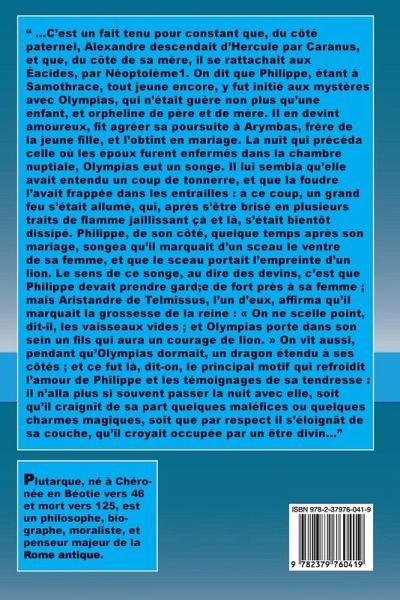 " ...C’est un fait tenu pour constant que, du côté paternel, Alexandre descendait d’Hercule par Caranus, et que, du côté de sa mère, il se rattachait aux Éacides, par Néoptolème1. On dit que Philippe, étant à Samothrace, tout jeune encore, y fut initié aux mystères avec Olympias, qui n’était guère non plus qu’une enfant, et orpheline de père et de mère. Il en devint amoureux, fit agréer sa poursuite à Arymbas, frère de la jeune fille, et l’obtint en mariage. La nuit qui précéda celle où les époux furent enfermés dans la chambre nuptiale, Olympias eut un songe. Il lui sembla qu’elle avait entendu un coup de tonnerre, et que la foudre l’avait frappée dans les entrailles : à ce coup, un grand feu s’était allumé, qui, après s’être brisé en plusieurs traits de flamme jaillissant çà et là, s’était bientôt dissipé. Philippe, de son côté, quelque temps après son mariage, songea qu’il marquait d’un sceau le ventre de sa femme, et que le sceau portait l’empreinte d’un lion. Le sens de ce songe, au dire des devins, c’est que Philippe devait prendre gard;e de fort près à sa femme ; mais Aristandre de Telmissus, l’un d’eux, affirma qu’il marquait la grossesse de la reine : « On ne scelle point, dit-il, les vaisseaux vides ; et Olympias porte dans son sein un fils qui aura un courage de lion. » On vit aussi, pendant qu’Olympias dormait, un dragon étendu à ses côtés ; et ce fut là, dit-on, le principal motif qui refroidit l’amour de Philippe et les témoignages de sa tendresse : il n’alla plus si souvent passer la nuit avec elle, soit qu’il craignît de sa part quelques maléfices ou quelques charmes magiques, soit que par respect il s’éloignât de sa couche, qu’il croyait occupée par un être divin..."