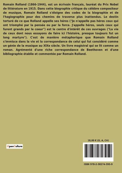 Romain Rolland (1866-1944), est un écrivain français, lauréat du Prix Nobel de littérature en 1915. Dans cette biographie critique du célèbre compositeur de musique, Romain Rolland s'éloigne des codes de la biographie et de l'hagiographie pour des chemins de traverse plus inattendus. Le destin torturé de ce que Rolland appelle ses héros ("Je n'appelle pas héros ceux qui ont triomphé par la pensée ou par la force. J'appelle héros, seuls ceux qui furent grands par le coeur") est le centre d'intérêt de ces ouvrages ("La vie de ceux dont nous essayons de faire ici l'histoire, presque toujours fut un long martyre"). C'est de manière métaphorique que Romain Rolland s'immisce dans la vie et la correspondance de celui qui fut considéré comme un génie de la musique au XIXe siècle. Un livre magistral qui se lit comme un roman. Un court ouvrage agrémenté d'une correspondance de Beethoven et d'une bibliographie établie et commentée par Romain Rolland.
