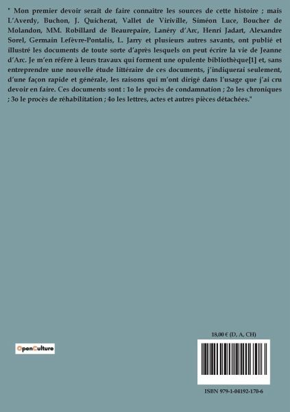 Attention texte d'introduction du maître-ouvrage de Romain Rolland et non version intégrale. " Mon premier devoir serait de faire connaître les sources de cette histoire ; mais L¿Averdy, Buchon, J. Quicherat, Vallet de Viriville, Siméon Luce, Boucher de Molandon, MM. Robillard de Beaurepaire, Lanéry d¿Arc, Henri Jadart, Alexandre Sorel, Germain Lefèvre-Pontalis, L. Jarry et plusieurs autres savants, ont publié et illustré les documents de toute sorte d¿après lesquels on peut écrire la vie de Jeanne d¿Arc. Je m¿en réfère à leurs travaux qui forment une opulente bibliothèque[1] et, sans entreprendre une nouvelle étude littéraire de ces documents, j¿indiquerai seulement, d¿une façon rapide et générale, les raisons qui m¿ont dirigé dans l¿usage que j¿ai cru devoir en faire. Ces documents sont : 1o le procès de condamnation ; 2o les chroniques ; 3o le procès de réhabilitation ; 4o les lettres, actes et autres pièces détachées."