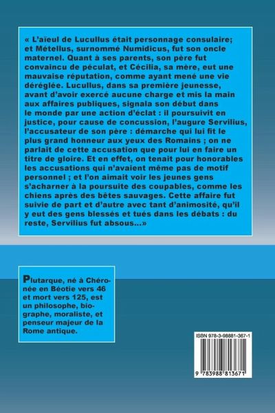 L'aïeul de Lucullus était personnage consulaire; et Métellus, surnommé Numidicus, fut son oncle maternel. Quant à ses parents, son père fut convaincu de péculat, et Cécilia, sa mère, eut une mauvaise réputation, comme ayant mené une vie déréglée. Lucullus, dans sa première jeunesse, avant d'avoir exercé aucune charge et mis la main aux affaires publiques, signala son début dans le monde par une action d'éclat : il poursuivit en justice, pour cause de concussion, l'augure Servilius, l'accusateur de son père : démarche qui lui fit le plus grand honneur aux yeux des Romains ; on ne parlait de cette accusation que pour lui en faire un titre de gloire. Et en effet, on tenait pour honorables les accusations qui n'avaient même pas de motif personnel ; et l'on aimait voir les jeunes gens s'acharner à la poursuite des coupables, comme les chiens après des bêtes sauvages. Cette affaire fut suivie de part et d'autre avec tant d'animosité, qu'il y eut des gens blessés et tués dans les débats : du reste, Servilius fut absous...
