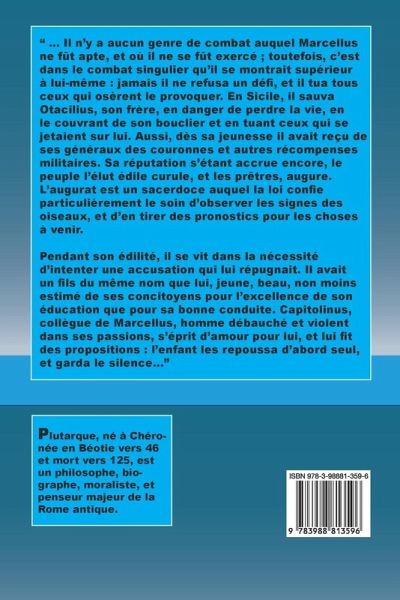 " ... Il n'y a aucun genre de combat auquel Marcellus ne fût apte, et où il ne se fût exercé ; toutefois, c'est dans le combat singulier qu'il se montrait supérieur à lui-même : jamais il ne refusa un défi, et il tua tous ceux qui osèrent le provoquer. En Sicile, il sauva Otacilius, son frère, en danger de perdre la vie, en le couvrant de son bouclier et en tuant ceux qui se jetaient sur lui. Aussi, dès sa jeunesse il avait reçu de ses généraux des couronnes et autres récompenses militaires. Sa réputation s'étant accrue encore, le peuple l'élut édile curule, et les prêtres, augure. L'augurat est un sacerdoce auquel la loi confie particulièrement le soin d'observer les signes des oiseaux, et d'en tirer des pronostics pour les choses à venir. Pendant son édilité, il se vit dans la nécessité d'intenter une accusation qui lui répugnait. Il avait un fils du même nom que lui, jeune, beau, non moins estimé de ses concitoyens pour l'excellence de son éducation que pour sa bonne conduite. Capitolinus, collègue de Marcellus, homme débauché et violent dans ses passions, s'éprit d'amour pour lui, et lui fit des propositions : l'enfant les repoussa d'abord seul, et garda le silence..."