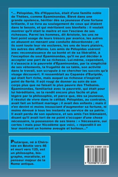 "... Pélopidas, fils d'Hippoclus, était d'une famille noble de Thèbes, comme Épaminondas. Élevé dans une grande opulence, héritier dès sa jeunesse d'une fortune brillante, il se livra au soulagement de ceux qui étaient dans le besoin, et qui méritaient ses bienfaits : il voulait montrer qu'il était le maître et non l'esclave de ses richesses. Parmi les hommes, dit Aristote, les uns ne font point usage de leurs trésors par avarice, les autres en abusent en menant une conduite désordonnée ; et ils sont toute leur vie esclaves, les uns de leurs plaisirs, les autres des affaires. Les amis de Pélopidas usèrent avec reconnaissance de sa bonté et de sa libéralité, à l'exception du seul Épaminondas, qu'il ne put décider à accepter une part de sa richesse. Lui-même, cependant, il s'associa à la pauvreté d'Épaminondas, par la simplicité de ses vêtements, la frugalité de sa table, son activité dans le travail, son scrupule à ne chercher les succès qu'à visage découvert. Il ressemblait au Capanée d'Euripide, qui était fort riche, mais auquel sa richesse n'inspirait point de fierté. Il eût rougi de donner au soin de son corps plus que ne faisait le plus pauvre des Thébains. Épaminondas, familiarisé avec la pauvreté, qui était pour lui héréditaire, se la rendit encore plus facile et plus légère par la philosophie, et parce que, dès sa jeunesse, il résolut de vivre dans le célibat. Pélopidas, au contraire, avait fait un brillant mariage ; il avait des enfants ; mais il n'en devint ni moins insouciant d'augmenter sa fortune, ni moins dévoué à tous les instants au service de sa patrie. Il avait perdu de son opulence, et ses amis l'en blâmaient, disant qu'il avait tort de ne point s'occuper d'une chose nécessaire, la possession de ses biens : Nécessaire, oui certes ! mais pour Nicodème que voici, répondit-il en leur montrant un homme aveugle et boiteux..."
