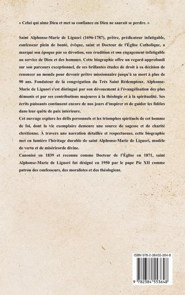 Celui qui aime Dieu et met sa confiance en Dieu ne saurait se perdre. Saint Alphonse-Marie de Liguori (1696-1787), prêtre, prédicateur infatigable, confesseur plein de bonté, évêque, saint et Docteur de l'Église Catholique, a marqué son époque par sa dévotion, son érudition et son engagement infatigable au service de Dieu et des hommes. Cette biographie offre un regard approfondi sur son parcours exceptionnel, de ses brillantes études de droit à sa décision de renoncer au monde pour devenir prêtre missionnaire jusqu'à sa mort à plus de 90 ans. Fondateur de la congrégation du Très Saint Rédempteur, Alphonse-Marie de Liguori s'est distingué par son dévouement à l'évangélisation des plus démunis et par ses contributions majeures à la théologie et à la spiritualité. Ses écrits puissants continuent encore de nos jours d'inspirer et de guider les fidèles dans leur quête de paix intérieure.Cet ouvrage explore les défis personnels et les triomphes spirituels de cet homme de foi, dont la vie exemplaire demeure une source de sagesse et de charité chrétienne. À travers une narration détaillée et respectueuse, cette biographie met en lumière l'héritage durable de saint Alphonse-Marie de Liguori, modèle de vertu et de miséricorde divine.Canonisé en 1839 et reconnu comme Docteur de l'Église en 1871, saint Alphonse-Marie de Liguori fut désigné en 1950 par le pape Pie XII comme patron des confesseurs, des moralistes et des théologiens. Extrait : Dans tous les âges du monde, la Providence a suscité des personnages extraordinaires, pour subvenir aux grands besoins de l'humanité ; le Seigneur, qui veille incessamment au bien de son Église, l'a pourvue, dans tous les siècles, de ces hommes d'élite qui la défendent et l'édifient. Or, selon le témoignage des Souverains Pontifes, parmi les plus grandes lumières qui font l'ornement de l'Église catholique, on voit briller du plus bel éclat saint Alphonse de Liguori ; parmi les écrivains distingués qui arrêtèrent le torrent des mauvaises doctrines, on compte à bon droit cet homme très saint et très savant, dont les ouvrages sont remplis de la plus sublime sagesse et de la plus tendre piété. Il a reçu d'en haut la science des saints, le Seigneur l'a enrichi de mérites dans les plus glorieux travaux ; destiné de Dieu pour faire entrer les peuples dans la pénitence, il a exterminé les abominations de l'impiété ; il a tourné son cur vers Dieu et affermi la piété dans un temps de péchés ; tant qu'il a vécu, il a été une des principales colonnes de la maison du Seigneur, et il a fortifié le temple de Dieu tous les jours de sa vie. Il s'est levé comme un prophète puissant en paroles et en uvres, au milieu d'une génération perverse et corrompue.