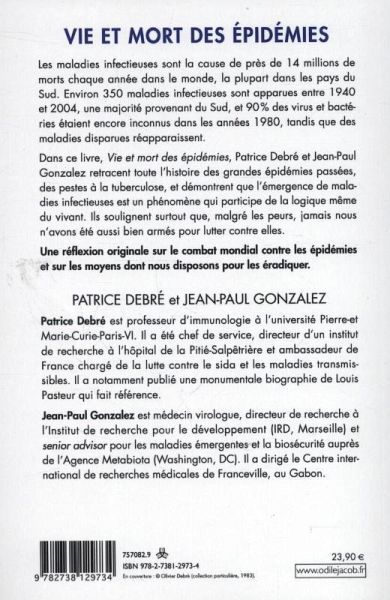 ?Les maladies infectieuses sont la cause de près de 14 millions de morts, chaque année dans le monde, la plupart dans les pays du Sud. Environ 350 maladies infectieuses sont apparues entre 1940 et 2004, une majorité provenant du Sud, et 90 % des virus et bactéries étaient encore inconnus dans les années 1980, tandis que des maladies disparues réapparaissent. Dans ce livre, Patrice Debré et Jean-Paul Gonzalez retracent toute l'histoire des grandes épidémies passées, des pestes à la tuberculose, et démontrent que l'émergence de maladies infectieuses est un phénomène qui participe de la logique même du vivant. Ils soulignent surtout que, malgré les peurs, jamais nous n'avons été aussi bien armés pour lutter contre elles. Une réflexion originale sur le combat mondial contre les épidémies et sur les moyens dont nous disposons pour les éradiquer. Patrice Debré est professeur d'immunologie à l'université Pierre-et Marie-Curie-Paris-VI. Il a été chef de service, directeur d'un institut de recherche à l'hôpital de la Pitié-Salpêtrière et ambassadeur de France chargé de la lutte contre le sida et les maladies transmissibles. Il a notamment publié une monumentale biographie de Louis Pasteur qui fait référence. Jean-Paul Gonzalez est médecin virologue, directeur de recherche à l'Institut de recherche pour le développement (IRD, Marseille) et senior advisor pour les maladies émergentes et la biosécurité auprès de l'Agence Metabiota (Washington, DC). Il a dirigé le Centre international de recherches médicales de Franceville, au Gabon.