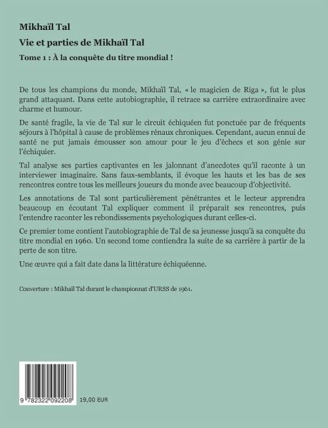 De tous les champions du monde, Mikhaïl Tal, "le magicien de Riga", fut le plus grand attaquant. Dans cette autobiographie, il retrace sa carrière extraordinaire avec charme et humour.