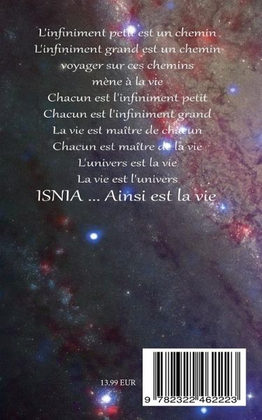 Une fiction.Une fiction... Mais qui peut le savoir.Chaque être est un universL'être est ce qui vieVoyager dans l'infiniment petit.Voyager dans l'infiniment grand.L'être est crée dans la vie par le grand.L'être est le créateur de vie dans le petit.Où chaque être est une partie de l'univers.L'être peut être un univers ou dans un univers.Mais l'un ou l'autre est nécessaire à cette existence.La VIE...Le parcours d'un homme dans le mal être ou la maladie.Il va parcourir en de multiples aventure l'infiniment grand.Pour créer l'infiniment petit.
