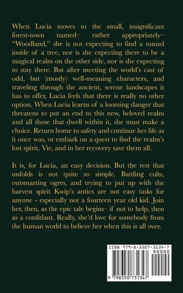 When Lucia moves to the small, insignificant forest-town named- rather appropriately- "Woodland," she is not expecting to find a tunnel inside of a tree, nor is she expecting there to be a magical realm on the other side, nor is she expecting to stay there. But after meeting the world's cast of odd, but (mostly) well-meaning characters, and traveling through the ancient, serene landscapes it has to offer, Lucia feels that there is really no other option. When Lucia learns of a looming danger that threatens to put an end to this new, beloved realm and all those that dwell within it, she must make a choice. Return home to safety and continue her life as it once was, or embark on a quest to find the realm's lost spirit, Vie, and in her recovery save them all. It is, for Lucia, an easy decision. But the rest that unfolds is not quite so simple. Battling cults, outsmarting ogres, and trying to put up with the harvest spirit Kwip's antics are not easy tasks for anyone - especially not a fourteen year old kid. Join her, then, as the epic tale begins- if not to help, then as a confidant. Really, she'd love for somebody from the human world to believe her when this is all over.