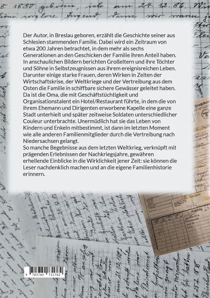 Der Autor, in Breslau geboren, erzählt die Geschichte seiner aus Schlesien stammenden Familie und ihre Geschicke über ein Zeitraum von sechs Generationen. Bildern berichten Großeltern und ihre Töchter und Söhne aus ihrem ereignisreichen Leben. Darunter einige starke Frauen, deren Wirken in Zeiten der Wirtschaftskrise, der Weltkriege und der Vertreibung aus dem Osten die Familie in schiffbare sichere Gewässer geleitet haben. Da ist die Oma, die mit Geschäftstüchtigkeit und Organisationstalent ein Hotel führte, in dem die von ihrem Ehemann und Dirigenten erworbene Kapelle eine ganze Stadt unterhielt und zeitweise Soldaten unterschiedlicher Couleur unterbrachte. Unermüdlich hat sie das Leben von Kindern und Enkeln mitbestimmt, ist dann im letzten Moment wie alle anderen Familienmitglieder durch die Vertreibung nach Niedersachsen gelangt.So manche Begebnisse aus dem Krieg und den Jahrem danach gewähren Blick in die Wirklichkeit jener Zeit: sie können die Leser nachdenklich machen und an die eigene Familienhistorie erinnern.