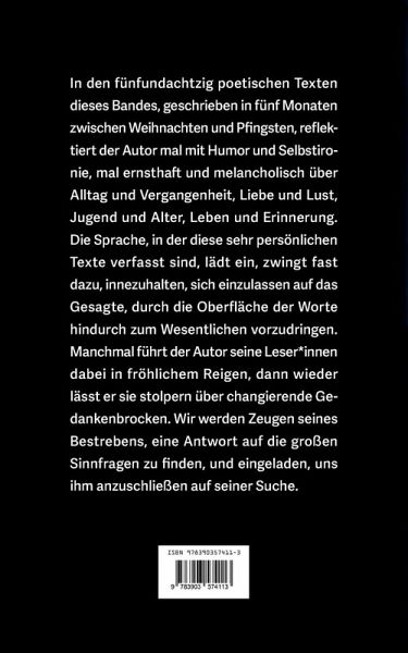 In den fünfundachtzig poetischen Texten dieses Bandes, geschrieben in fünf Monaten zwischen Weihnachten und Pfingsten, reflektiert der Autor mal mit Humor und Selbstironie, mal ernsthaft und melancholisch über Alltag und Vergangenheit, Liebe und Lust, Jugend und Alter, Leben und Erinnerung. Die Sprache, in der diese sehr persönlichen Texte verfasst sind, lädt ein, zwingt fast dazu, innezuhalten, sich einzulassen auf das Gesagte, durch die Oberfläche der Worte hindurch zum Wesentlichen vorzudringen. Manchmal führt der Autor seine Leser_innen dabei in fröhlichem Reigen, dann wieder lässt er sie stolpern über changierende Gedankenbrocken. Wir werden Zeugen seines Bestrebens, eine Antwort auf die großen Sinnfragen zu finden, und eingeladen, uns ihm anzuschließen auf seiner Suche.
