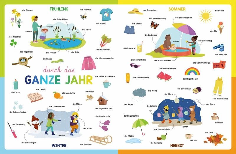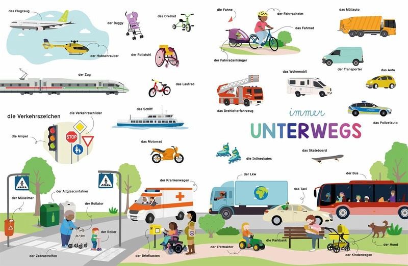 Ein großes Buch, mit dem Kleine ab 18 Monaten in die große Welt der Sprache starten können. Über 250 Dinge sind hier in vielen kleinen Einzelillustrationen und spannenden Szenenbildern dargestellt und mit Substantiven samt Artikeln und Verben benannt. Es geht ums Spielen drinnen und draußen, ums Essen und Wohnen, um Tiere, die Jahreszeiten und um Fahrzeuge. Ein Buch, das in keinem Kinderzimmer fehlen darf und mit seinen Leser_innen mitwächst!