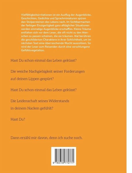 Vielfältigkeitsirritationen ist ein Ausflug der Augenblicke. Geschichten, Gedichte und Skizzen spüren den Stolpersteinen des Lebens nach. Im Sichtbarmachen der farbigen Einzigartigkeit ganz alltäglicher Situationen werden einmalige Augenblicke erschaffen. Kleine Träume entfalten sich vor dem Leser. Mal berühren die geschilderten Charaktere in ihrer Schlichtheit, um im nächsten Text eine überraschende Wucht auszulösen. So wird der Leser zum Reisenden durch eine verschlungene Gefühlsvegetation.