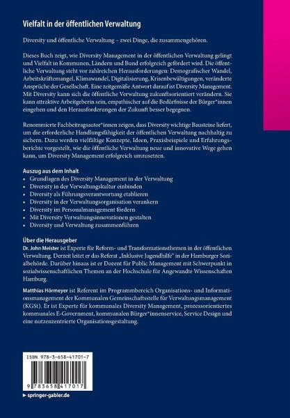 Renommierte Fachbeitragsautor_innen zeigen, dass Diversity wichtige Bausteine liefert, um die erforderliche Handlungsfähigkeit der öffentlichen Verwaltung nachhaltig zu sichern. Dazu werden vielfältige Konzepte, Ideen, Praxisbeispiele und Erfahrungsberichte vorgestellt, wie die öffentliche Verwaltung neue und innovative Wege gehen kann, um Diversity Management erfolgreich umzusetzen.