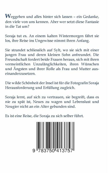 Weggehen, alles hinter sich lassen - ein Gedanke, den viele kennen. Aber wer, so frage ich Sie, setzt diese Fantasie in die Tat um?Losfahren, ohne Ziel, ohne Plan, ohne Gepäck, sich aufmachen, zu einer Reise ins Unbekannte.Soraja wagt es. An einem kalten Januarmorgen fährt sie los und ihre Reise ins Unbekannte, Ungewisse nimmt ihren Anfang.Nebst einem kleinen Koffer und der Fotoausrüstung hat sie ihre Ängste mit im Gepäck. Die Angst, Gesundheit, Arbeit oder Parntner zu verlieren, die Furcht vor dem Altern, dem Alleinsein, und das beklemmende Gefühl, im Leben zu viel verpasst und falsch gemacht zu haben.Sie strandet schliesslich auf Sylt, wo sie sich mit einer jungen Frau und deren kleinen Sohn anfreundet. Die Freundschaft fordert beide Frauen heraus, sich mit ihren Wünschen, Ängsten und ihrer Rolle als Frau und Mutter auseinanderzusetzen.Die wilde Schönheit der Insel ist für die Fotografin Soraja Herausforderung und Erfüllung zugleich. Sie bekommt Aufträge, sie hat Erfolg. Ist sie doch nicht nur die Versagerin, als die sie sich stets sah?Soraja lernt, auf sich zu vertrauen, erkennt ihre Stärken, legt Schuldgefühle ab und lässt Enttäuschungen los. Sie begreift, dass es nie zu spät ist, Neues zu wagen und Lebenslust und Neu-gier nicht an ein Alter gebunden sind. Es ist eine Reise, die Soraja zu sich selber führt.
