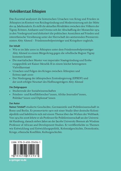 Das Essential analysiert die historischen Ursachen von Krieg und Frieden in Äthiopien im Kontext von Reichsgründung und Modernisierung seit der Mitte des 19. Jahrhunderts. Es stellt die aktuellen Rivalitäten zwischen den Völkern der Tigray, Eritreer, Amharen und Oromo seit der Abschaffung der Monarchie 1974 in den Vordergrund und diskutiert die politischen Aussichten auf Frieden und interethnische Versöhnung unter der Herrschaft des amtierenden Premierministers Abiy Ahmed - Friedensnobelpreisträger und Kriegsherr zugleich.