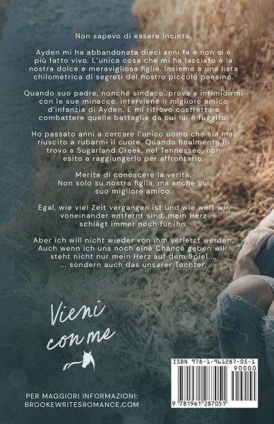 Un prequel dell'autrice di romanzi di piccoli borghi Brooke Montgomery in cui la storia d'amore dei due protagonisti riesce a sfidare il tempo, infatti si ritrovano dopo dieci anni e un segreto finalmente rivelato cambia tutto quanto... Non sapevo di essere incinta. Ayden mi ha abbandonata dieci anni fa e non si è più fatto vivo. L'unica cosa che mi ha lasciato è la nostra dolce e meravigliosa figlia. Insieme a una lista chilometrica di segreti del nostro piccolo paesino. Quando suo padre, nonché sindaco, prova a intimidirmi con le sue minacce, interviene il migliore amico d'infanzia di Ayden. E mi ritrovo costretta a combattere quelle battaglie da cui lui è fuggito. Ho passato anni a cercare l'unico uomo che sia mai riuscito a rubarmi il cuore. Quando finalmente lo trovo a Sugarland Creek, nel Tennessee, non esito a raggiungerlo per affrontarlo. Merita di conoscere la verità. Non solo su nostra figlia, ma anche sul suo migliore amico. Nonostante sia passato tantissimo tempo e tra di noi ci siano chilometri e chilometri di distanza, il mio cuore batte ancora per lui. Però non posso permettermi di soffrire di nuovo. Per quanto voglia dare un'altra chance al nostro amore, in gioco non c'è più soltanto il mio cuore... Ma anche quello di nostra figlia. Vieni con me è il prequel della serie Sugarland Creek. Se ti piacciono le storie con seconde chance, figli segreti e ambientate in piccoli borghi, allora ti innamorerai presto di Ayden, Laney e Serena! Ciascun libro della serie è autoconclusivo e termina con un lieto fine.