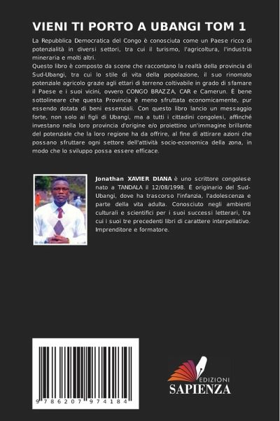 La Repubblica Democratica del Congo è conosciuta come un Paese ricco di potenzialità in diversi settori, tra cui il turismo, l'agricoltura, l'industria mineraria e molti altri. Questo libro è composto da scene che raccontano la realtà della provincia di Sud-Ubangi, tra cui lo stile di vita della popolazione, il suo rinomato potenziale agricolo grazie agli ettari di terreno coltivabile in grado di sfamare il Paese e i suoi vicini, ovvero CONGO BRAZZA, CAR e Camerun. È bene sottolineare che questa Provincia è meno sfruttata economicamente, pur essendo dotata di beni essenziali. Con questo libro lancio un messaggio forte, non solo ai figli di Ubangi, ma a tutti i cittadini congolesi, affinché investano nella loro provincia d'origine e/o proiettino un'immagine brillante del potenziale che la loro regione ha da offrire, al fine di attirare azioni che possano sfruttare ogni settore dell'attività socio-economica della zona, in modo che lo sviluppo possa essere efficace.