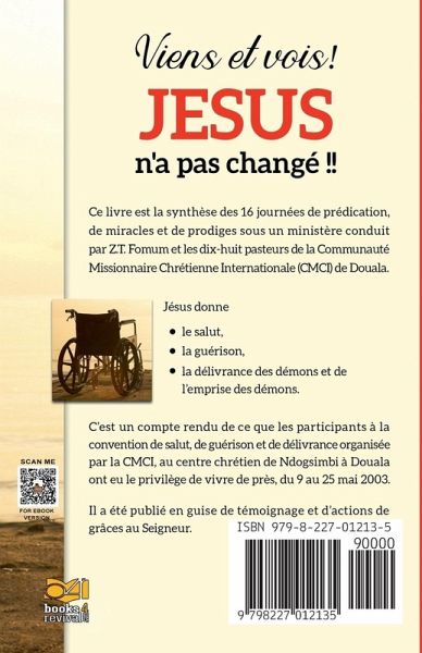 Ce livre est la synthèse des 16 journées de prédication, de miracles et de prodiges sous un ministère conduit par Z.T. Fomum et les dix-huit pasteurs de la Communauté Missionnaire Chrétienne Internationale (CMCI) de Douala.Jésus donne le salut, la guérison, la délivrance des démons et de l'emprise des démons. C'est un compte rendu de ce que les participants à la convention de salut, de guérison et de délivrance organisée par la CMCI, au centre chrétien de Ndogsimbi à Douala ont eu le privilège de vivre de près, du 9 au 25 mai 2003. Il a été publié en guise de témoignage et d'actions de grâces au Seigneur.