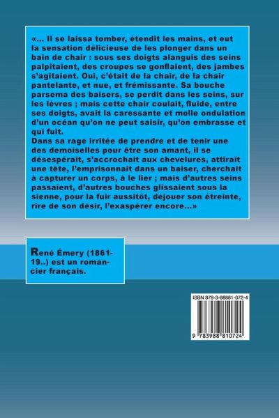 ... Il se laissa tomber, étendit les mains, et eut la sensation délicieuse de les plonger dans un bain de chair : sous ses doigts alanguis des seins palpitaient, des croupes se gonflaient, des jambes s'agitaient. Oui, c'était de la chair, de la chair pantelante, et nue, et frémissante. Sa bouche parsema des baisers, se perdit dans les seins, sur les lèvres ; mais cette chair coulait, fluide, entre ses doigts, avait la caressante et molle ondulation d'un océan qu'on ne peut saisir, qu'on embrasse et qui fuit. Dans sa rage irritée de prendre et de tenir une des demoiselles pour être son amant, il se désespérait, s'accrochait aux chevelures, attirait une tête, l'emprisonnait dans un baiser, cherchait à capturer un corps, à le lier ; mais d'autres seins passaient, d'autres bouches glissaient sous la sienne, pour la fuir aussitôt, déjouer son étreinte, rire de son désir, l'exaspérer encore...