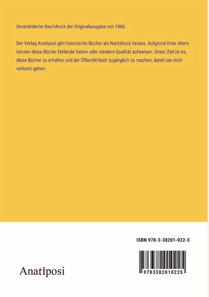 Unveränderter Nachdruck der Originalausgabe von 1860. Der Verlag Anatiposi gibt historische Bücher als Nachdruck heraus. Aufgrund ihres Alters können diese Bücher fehlende Seiten oder mindere Qualität aufweisen. Unser Ziel ist es, diese Bücher zu erhalten und der Öffentlichkeit zugänglich zu machen, damit sie nicht verloren gehen.