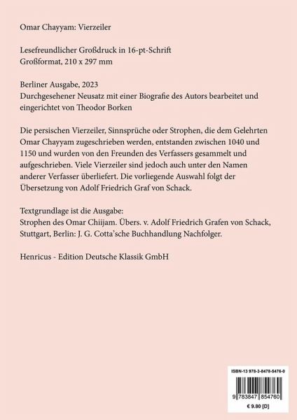 Omar Chayyam: VierzeilerLesefreundlicher Großdruck in 16-pt-SchriftGroßformat, 210 x 297 mmBerliner Ausgabe, 2023Durchgesehener Neusatz mit einer Biografie des Autors bearbeitet und eingerichtet von Theodor BorkenDie persischen Vierzeiler, Sinnsprüche oder Strophen, die dem Gelehrten Omar Chayyam zugeschrieben werden, entstanden zwischen 1040 und 1150 und wurden von den Freunden des Verfassers gesammelt und aufgeschrieben. Viele Vierzeiler sind jedoch auch unter den Namen anderer Verfasser überliefert. Die vorliegende Auswahl folgt der Übersetzung von Adolf Friedrich Graf von Schack.Textgrundlage ist die Ausgabe:Strophen des Omar Chiijam. Übers. v. Adolf Friedrich Grafen von Schack, Stuttgart, Berlin: J. G. Cotta'sche Buchhandlung Nachfolger, [o. J.].Gesetzt aus der Minion Pro, 16 pt.Henricus - Edition Deutsche Klassik GmbH