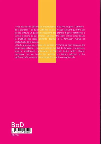 « Vies des enfants célèbres de tous les temps et de tous les pays : Panthéon de la jeunesse » de Julien Caboche est un ouvrage captivant qui offre aux jeunes lecteurs un panorama fascinant des grandes figures historiques à travers le prisme de leur enfance. Publié au XIXe siècle, ce livre s'inscrit dans la tradition des récits édifiants destinés à la formation morale et intellectuelle de la jeunesse. Caboche présente une galerie de portraits d'enfants qui sont devenus des personnages illustres, couvrant un large éventail de domaines : souverains, artistes, scientifiques, explorateurs et héros…mehr