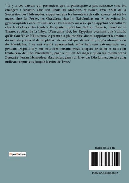 " Il y a des auteurs qui prétendent que la philosophie a pris naissance chez les étrangers : Aristote, dans son Traité du Magicien, et Sotion, livre XXIII de la Succession des Philosophes, rapportent que les inventeurs de cette science ont été les mages chez les Perses, les Chaldéens chez les Babyloniens ou les Assyriens, les gymnosophistes chez les Indiens, et les druides, ou ceux qüon appelait semnothées, chez les Celtes et les Gaulois. Ils ajoutent qüOchus était de Phénicie, Zamolxis de Thrace, et Atlas de la Libye. D¿un autre côté, les Égyptiens avancent que Vulcain, qüils font fils de Nilus, traita le premier la philosophie, dont ils appelaient les maîtres du nom de prêtres et de prophètes : ils veulent que, depuis lui jusqüà Alexandre roi de Macédoine, il se soit écoulé quarante-huit mille huit cent soixante-trois ans, pendant lesquels il y eut trois cent soixante-treize éclipses de soleil et huit cent trente-deux de lune. Pareillement, pour ce qui est des mages, qüon fait commencer à Zoroastre Persan, Hermodore platonicien, dans son livre des Disciplines, compte cinq mille ans depuis eux jusqüà la ruine de Troie."