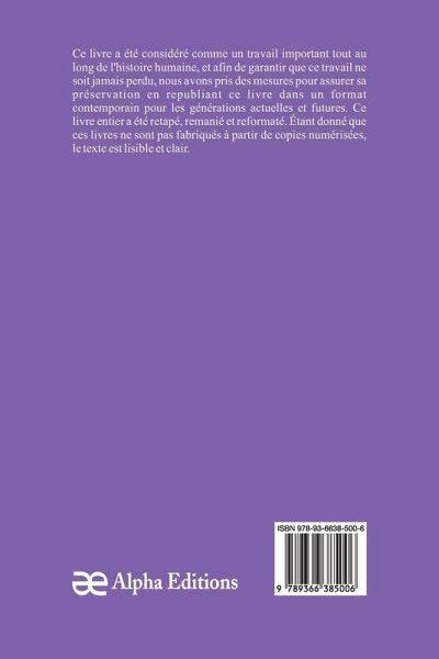 Vies imaginaires" est un livre classique, qui a eu une valeur significative tout au long de l'histoire, et pour garantir que sa sagesse intemporelle ne soit jamais perdue, Alpha Editions l'a soigneusement préservé en le republiant dans un format moderne et accessible aux générations présentes et futures. Soigneusement reformaté, retapé , et nouvellement conçue, cette édition offre un texte clair et lisible, sans copies numérisées de l'uvre originale, Alpha Editions se consacre à insuffler une nouvelle vie aux livres anciens et classiques, rendant ces trésors littéraires à nouveau disponibles pour les lecteurs qui chérissent l'histoire. culture et savoir intemporel.