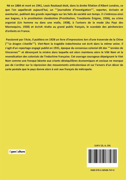 Né en 1884 et mort en 1941, Louis Roubaud était, dans la droite filiation d'Albert Londres, ce que l'on appellerait aujourd'hui, un ""journaliste d'investigation"", reporter, écrivain et aventurier, publiant des grands reportages sur les faits de société son temps. Il s'intéressa ainsi aux bagnes, à la prostitution clandestine (Prostitution, Troublante Énigme, 1936), au crime organisé (Un homme nu dans une malle, 1938), à l'univers de la mode (Au Pays des Mannequins, 1928) et écrivit révéla au grand public français, le scandale des pénitenciers d'enfants en France. Passionné par l'Asie, il publiera en 1928 un livre d'impressions lors d'une traversée de la Chine (""Le dragon s'éveille""). Viet-Nam la tragédie indochinoise est écrit dans la même veine. Il s'agit d'un reportage engagé publié en 1931, époque du consensus colonial dit des ""années de Vincennes"" et dénonçant la misère dans laquelle est alors maintenu alors le Viêt Nam et la revendication des colonisés de l'Indochine française. Cet ouvrage courageux dépeignant le Viet Nam comme une fresque béante aux criants déséquilibres économiques et sociaux ne manque pas de s'arrêter sur la répression des mouvements anticoloniaux et sur l'envers d'un décor de carte postale que le pays donne alors à voir aux français de métropole.