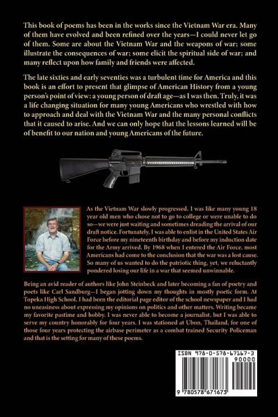 This book of poems has been in the works since the Vietnam War era. Many of them have evolved and been refined over the years -- I could never let go of them. Some are about The Vietnam War and the weapons of war; some illustrate the consequences of war; some elicit the spiritual side of war; and many reflect upon how family and friends were affected. The late sixties and early seventies was a turbulent time for America and this book is an effort to present that glimpse of American History from a young person's point of view: a young person of draft age -- as I was then. Truly, it was a life changing situation for many young Americans who wrestled with how to approach and deal with The Vietnam War and the many personal conflicts that it caused to arise. And we can only hope that the lessons learned will be of benefit to our natyion and young Americans of the future.