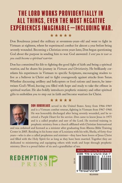 The Lord works providentially in all things, even the most negative experiences imaginable-including war. Don Boudreaux joined the military at seventeen-years-old and went to fight in Vietnam at eighteen, where he experienced combat for almost a year before being severely wounded. Becoming a Christian seven years later, Don began questioning God about the purpose in sending him to war. God answered: I sent you to war so you could become a spiritual warrior. Don has committed his life to fighting the good fight of faith and being a spiritual warrior, and he shares his journey in Vietnam and Christianity. He brilliantly correlates his experiences in Vietnam to specific Scriptures, encouraging readers to live as a believer in Christ and to fight courageously against attacks from Satan. Whether discussing artillery and helicopters or food rations and insects, he intertwines God's Word, leaving you filled with hope and ready to take the offense in spiritual warfare. He also boldly introduces prophetic ministry and other spiritual gifts to embolden you to step out in faith and become warriors for Christ.