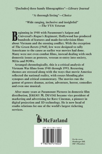 Beginning in 1948 with Paramount's Saigon and Universal's Rogue's Regiment, Hollywood has produced hundreds of features and made-for-television films about Vietnam and the ensuing conflict. With the exception of The Green Berets (1968), few were designed to rally Americans to the cause as earlier war movies had done. Many were not even combat films, instead dealing with such domestic issues as protests, veteran re-entry, MIAs and POWs. Arranged chronologically, this is a critical analysis of Vietnam War films from 1948 through 1993. Recurring themes are stressed along with the ways that movie America reflected the national reality, with essays blending plot synopses and critical commentary. The movies run the gamut of genres: dramas, action, adventure, horror, comedies and even one musical.