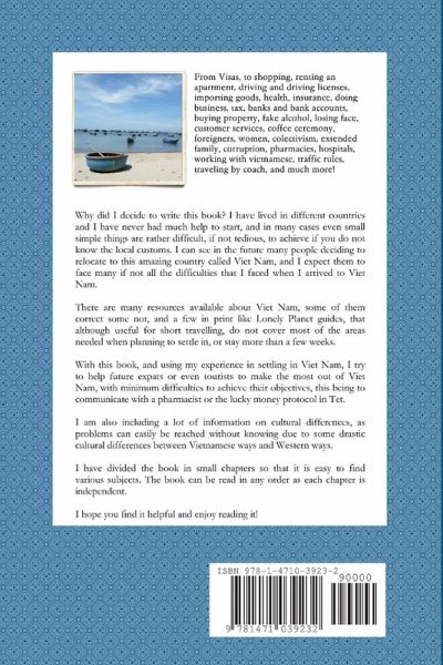 With this book, and using my experience in settling in Viet Nam, I try to help future expats or even tourists to make the most out of Viet Nam, with minimum difficulties to achieve their objectives, this being to communicate with a pharmacist or the lucky money protocol in Tet. I am also including a lot of information on cultural differences, as problems can easily be reached without knowing due to some drastic cultural differences between Vietnamese ways and Western ways. I have divided the book in small chapters so that it is easy to find various subjects. The book can be read in any order as each chapter is independent. I hope you find it helpful and enjoy reading it!